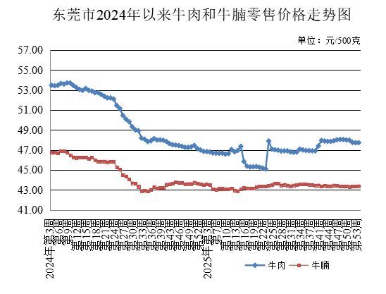 第53周,监测的牛肉农贸市场零售均价为每500克47.73元,与上周持平。牛腩农贸市场零售均价为每500克43.41元,较上周上升0.12%。鸡肉农贸市场零售均价为每500克16.91元,较上周下降0.24%。